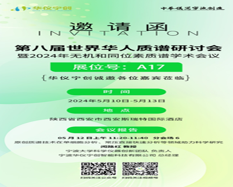 會議邀請 | 華儀寧創與您相約第八屆世界華人質譜研討會暨2024年無機和同位素質譜學術會議 2024-04-30 由中國物理學會質譜分會 (中國質譜學會)主辦,西安交通大學承辦,西北核技術研究院協辦的《第八屆世界華人質譜研討會暨 2024 年無機和同位素質譜學術會議》將于 2024 年 5 月 10 日至 13 日在西安市召開。華儀寧創作為國內質譜儀器自主創新優秀企業代表,受邀參加此次會議。華儀寧創總經理聞路紅教授將在分會場6作《原創質譜技術在單細胞分析、常壓直接快速分析等領域助力科學研究》專題報告。華儀寧創此次將在A17展臺展出多款原創質譜產品,在此誠邀各位專家學者蒞臨展臺,探討交流!便攜式直接電離質譜儀CRAIV-110三重四極桿串聯質譜系統… 查看詳情