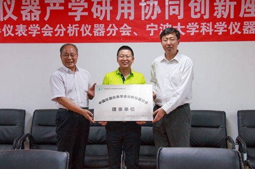 中國儀器儀表學會分析儀器分會理事長關亞風、常務副理事長劉長寬代表分會向寧波華儀寧創智能科技有限公司總經理聞路紅授牌。