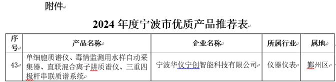 近日,寧波市經濟和信息化局正式公布了《2024年度寧波市優質產品推薦目錄》,華儀寧創自主研發的單細胞質譜儀、毒情監測用水樣自動采集器、直聯混合離子阱質譜儀、三重四極桿串聯質譜系統成功入選。據悉,列入寧波市優質產品推薦目錄的企業產品,可優先參與政府及國有投資項目建設,在市場拓展方面贏得先機。