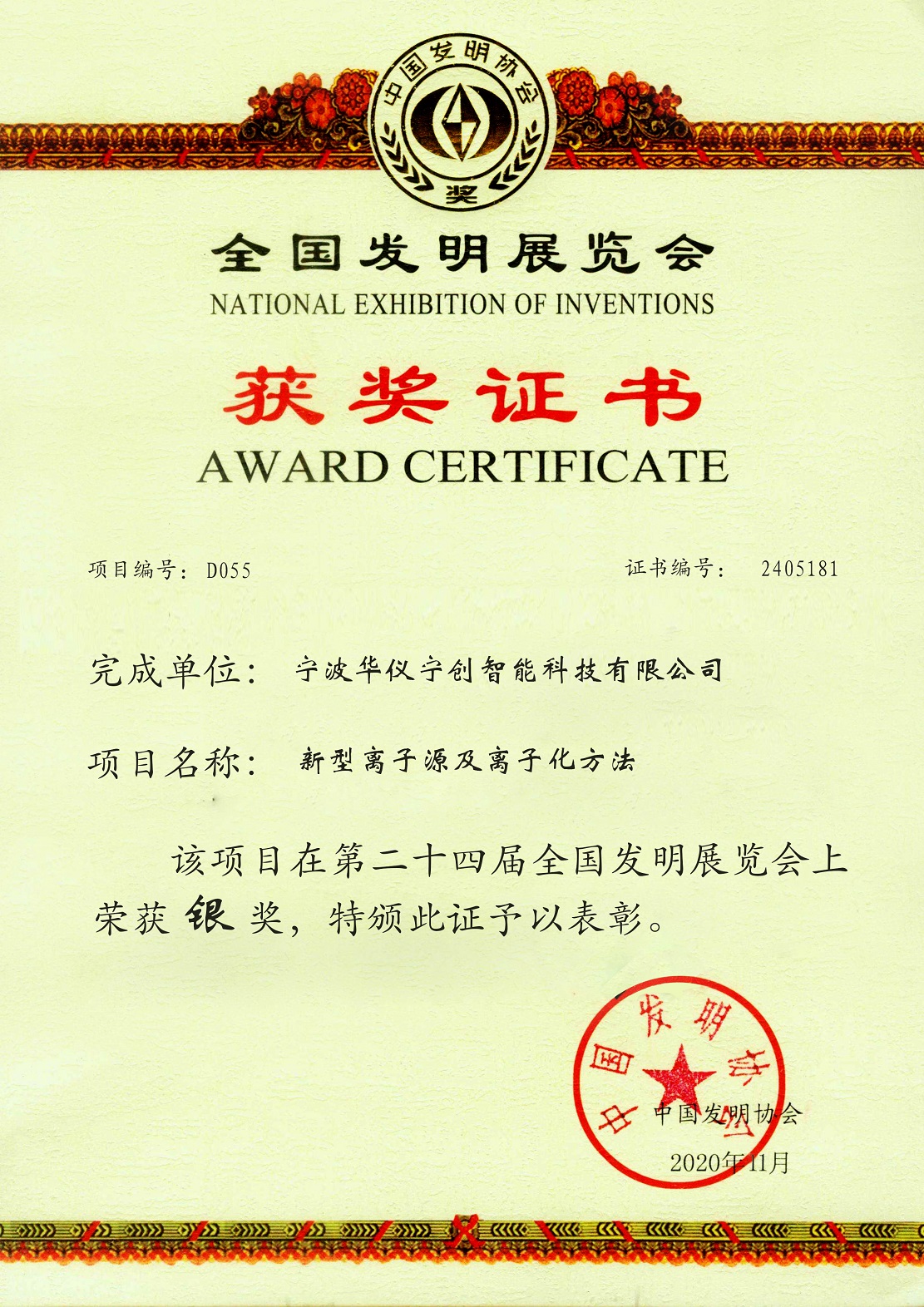 2020年11月21日,為期3天的第二十四屆全國發明展覽會——一帶一路暨金磚國家技能發展與技術創新大賽在佛山閉幕。寧波華儀寧創智能科技有限公司參展發明專利“新型離子源及離子化方法”獲得本屆“發明創業獎”銀獎。